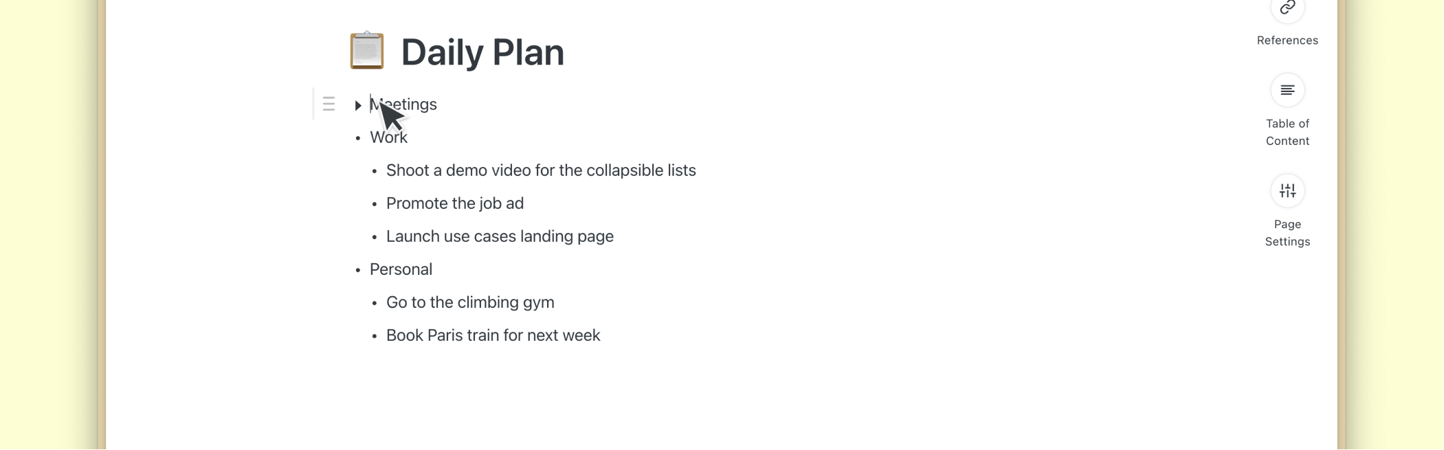 Sie können Ihre Seiten mithilfe von zusammenklappbaren Listen organisieren. Reduzieren und erweitern Sie jede Aufzählung, um verschachtelte Elemente bei Bedarf ein- oder auszublenden.