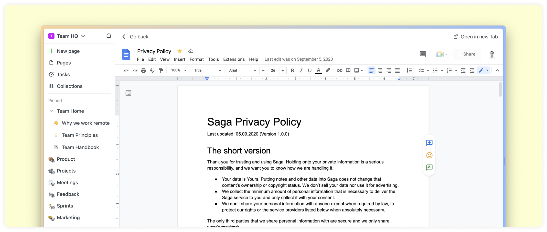 Wenn Sie auf eine auf einer Seite erwähnte Datei klicken, wird sie in voller Breite direkt in Saga geöffnet. Du kannst auch die Shift-Taste gedrückt halten und dann auf die Datei klicken, um sie nebeneinander zu öffnen. Du kannst jederzeit zu deiner vorherigen Seite in Saga zurückkehren oder die Datei in einem neuen Tab in deinem Browser öffnen.