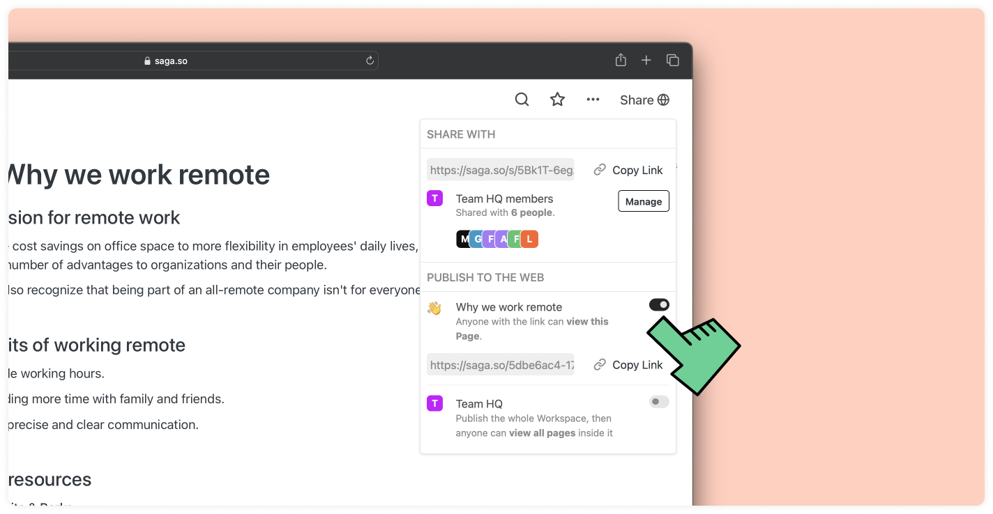 Mit Saga können Sie eine einzelne Seite als öffentliche Website teilen, sodass Sie Ihre Inhalte mit der Außenwelt teilen können.