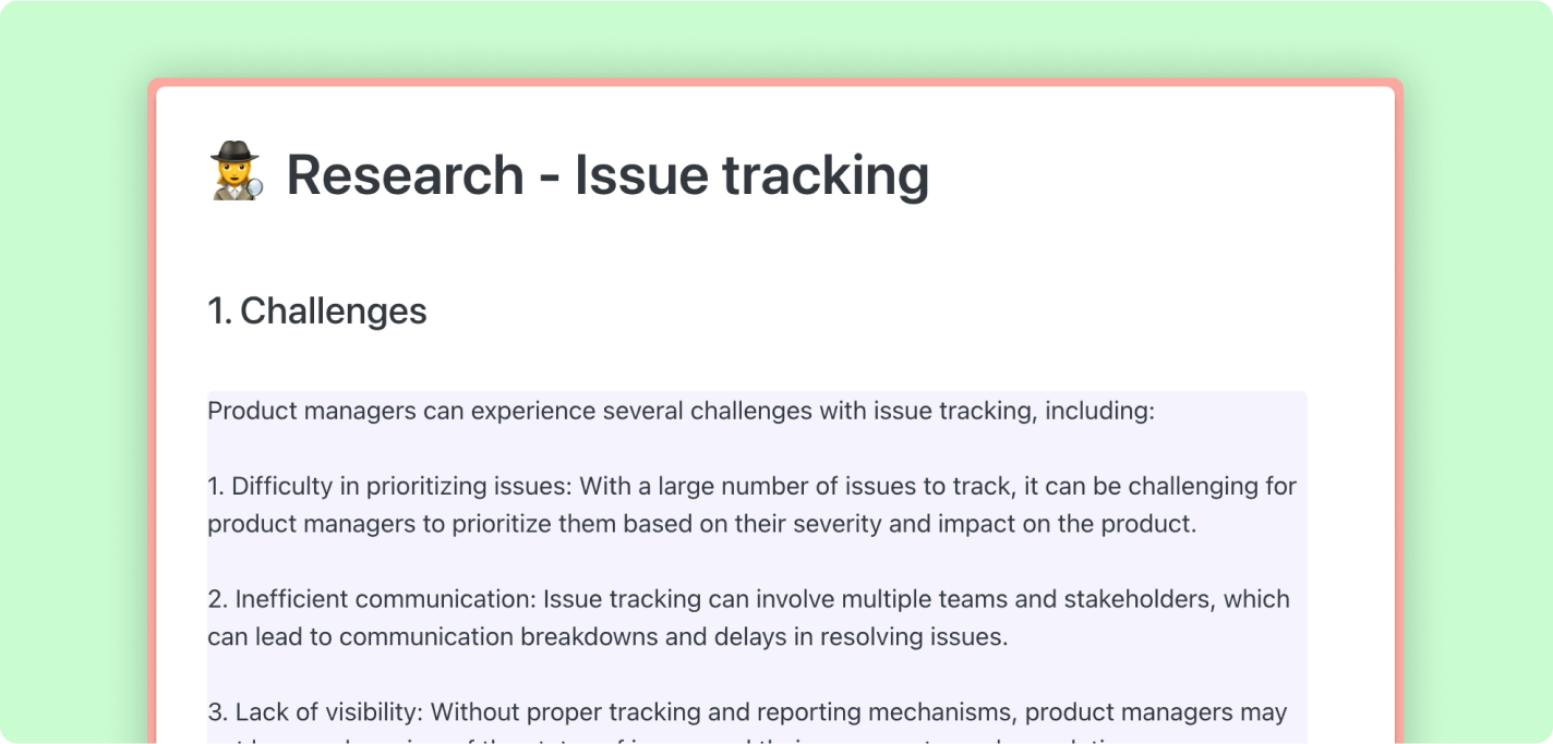 Wenn Sie nach bestimmten Erkenntnissen suchen, passen Sie einfach die KI-Eingabeaufforderung an, indem Sie Ihr Dokument auswählen und auf Saga KI, und geben Sie ein, was Sie interessiert, z. B. „Surface Insights on Issue Tracking“. Für weitere Tipps Lesen Sie diese Anleitung zum Schreiben besserer KI-Eingabeaufforderungen.