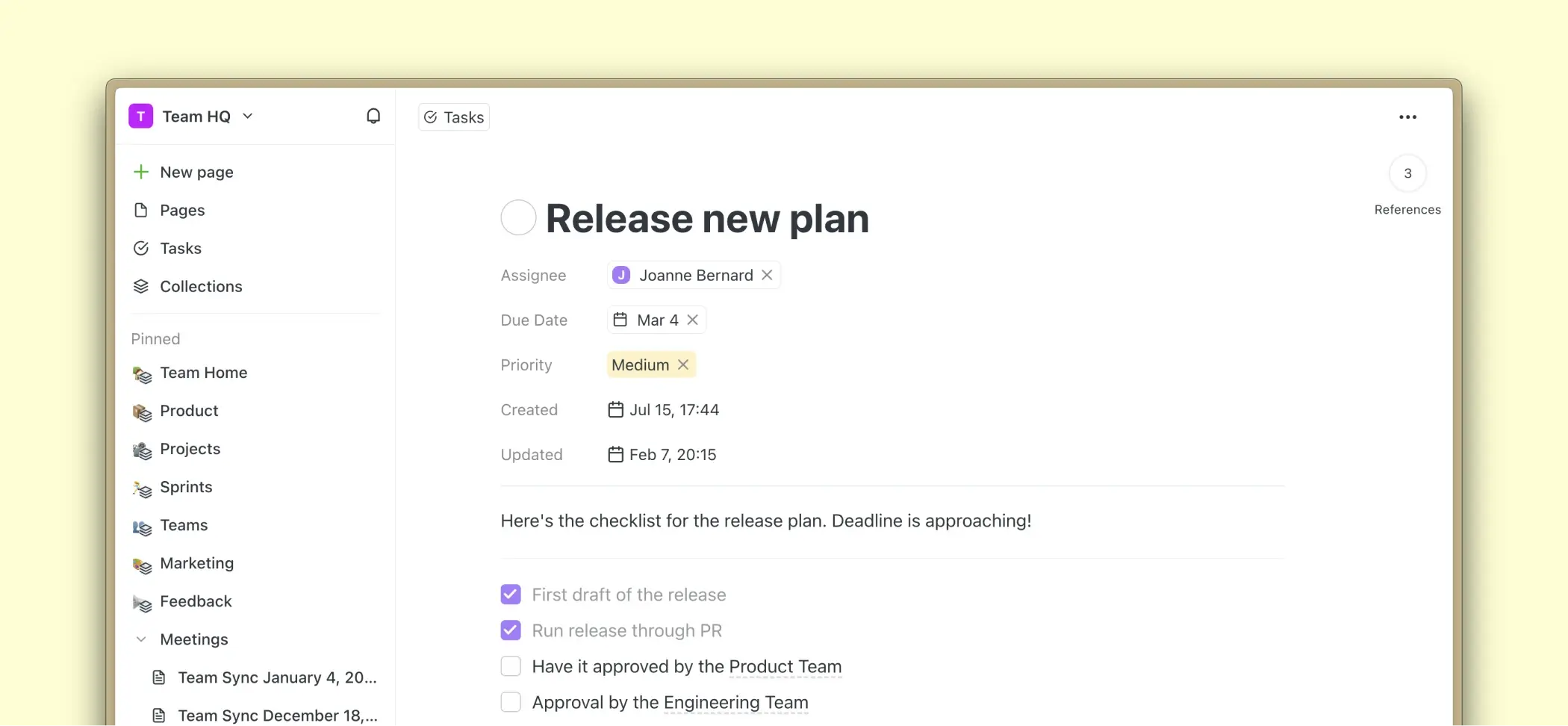 Um eine Aufgabe zu entfernen, die auf einer Seite oder einer anderen Aufgabe erwähnt wird, verwenden Sie einfach die Rücktaste, um sie aus dem Inhalt der Seite zu löschen, genau wie Sie normalen Text entfernen würden. Durch diese Aktion wird der Aufgabenblock entfernt, die Aufgabe wird jedoch nicht aus deinem Workspace gelöscht.