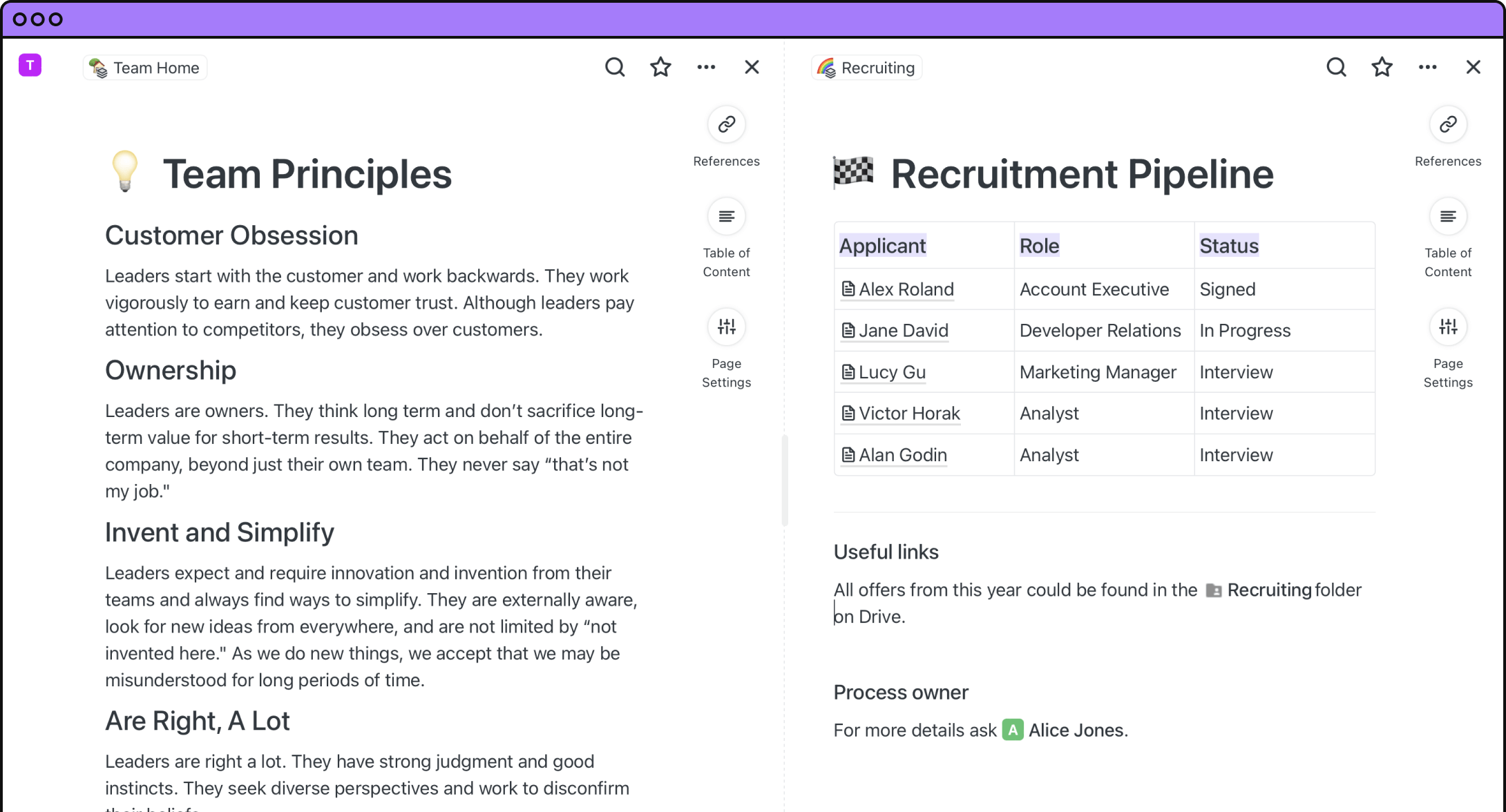 Mit Autolinks verweist Saga automatisch auf alle Stellen, an denen ein Seitentitel erwähnt wird. Nützlich, um all Ihre Kandidateninformationen miteinander zu verknüpfen.