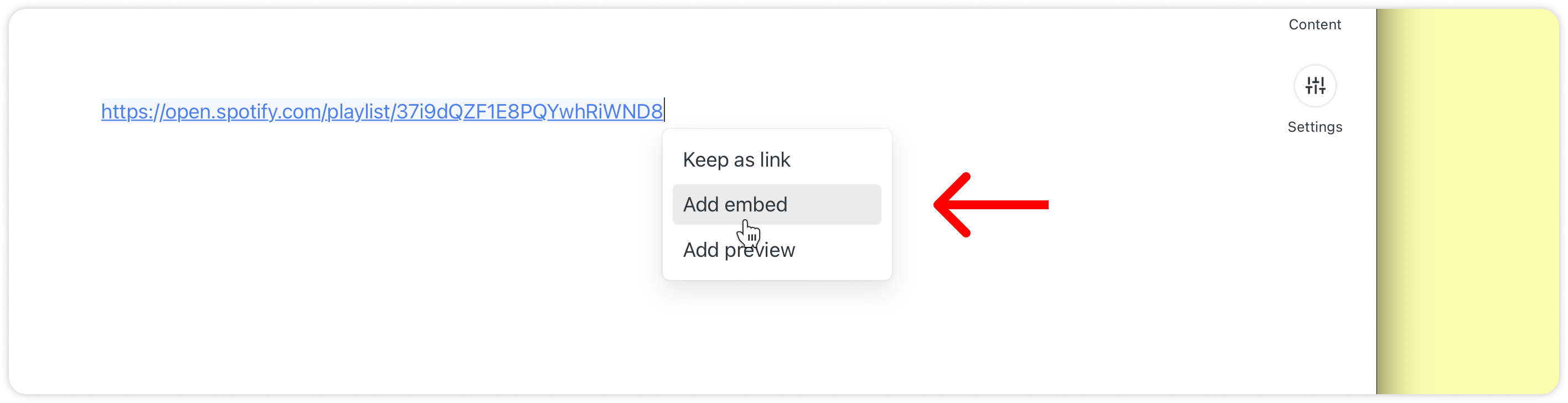 Para añadir una incrustación a una página, pega un enlace en el editor. Haga clic en Agregar incrustación desde el menú desplegable.