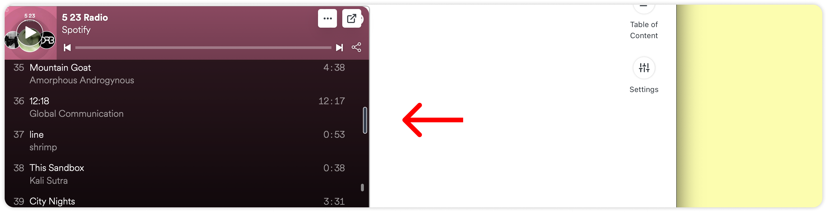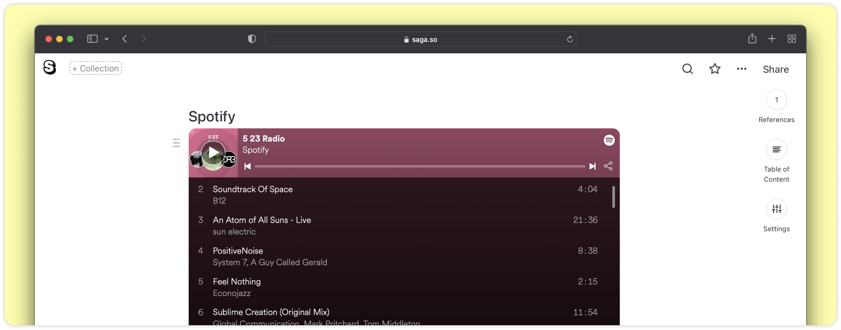 ¡Inserta contenido de otras aplicaciones en Saga! Visualiza tus archivos de diseño desde Figma, reproduce archivos de audio desde Soundcloud, añade tu Spotify lista de reproducción o previsualización de fragmentos de código de Código y caja sin salir de tu espacio de trabajo.