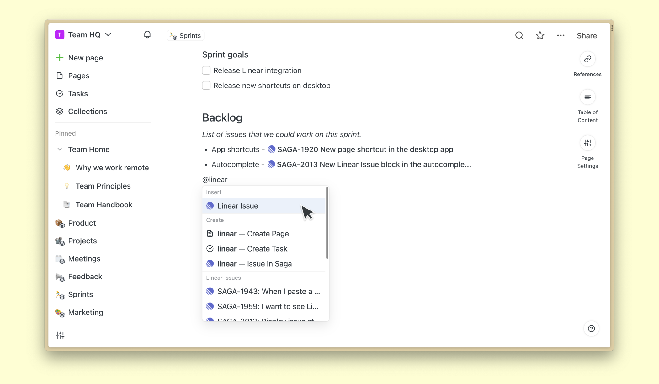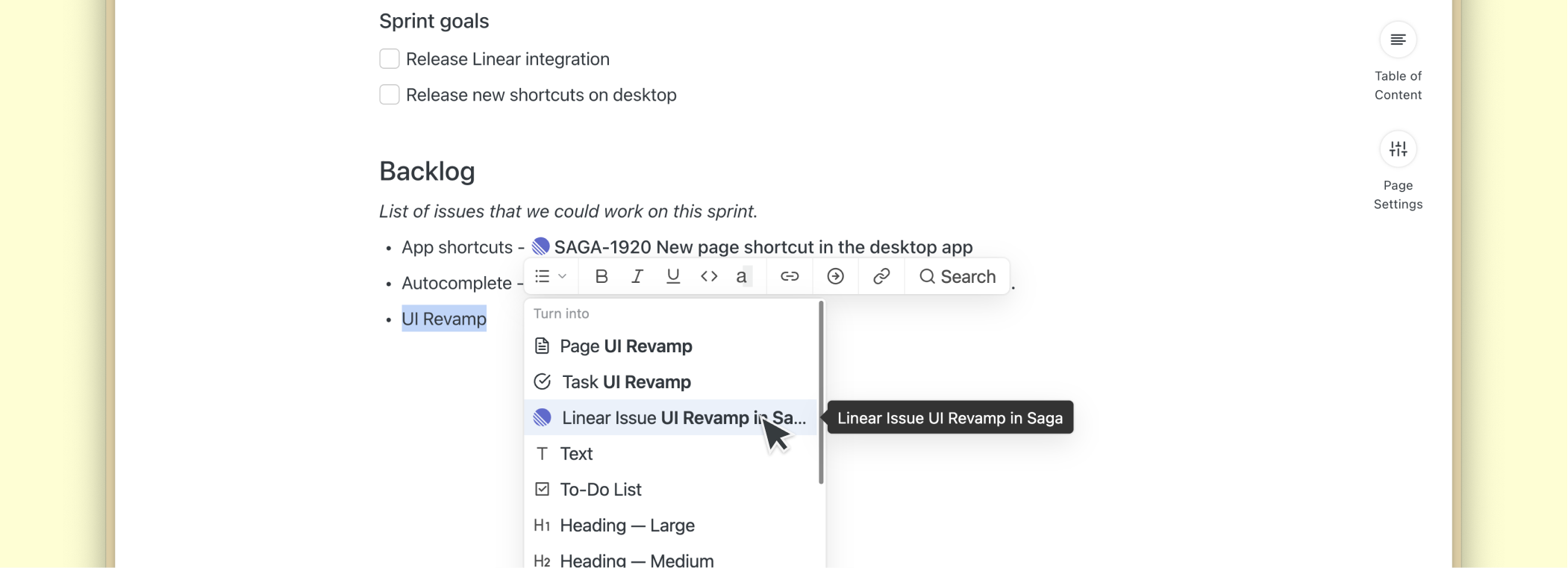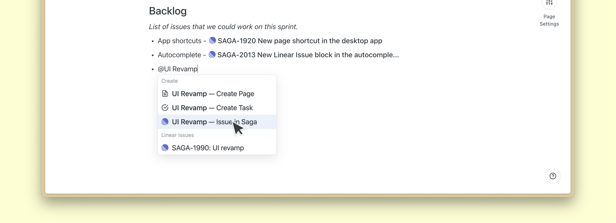 Cuando pegues un enlace a un número de Linear dentro de una página, Saga te sugerirá que lo conviertas en una mención en lugar de pegar la dirección URL. Usa las menciones para que tus páginas tengan un mejor aspecto y se comuniquen más claramente con los demás.