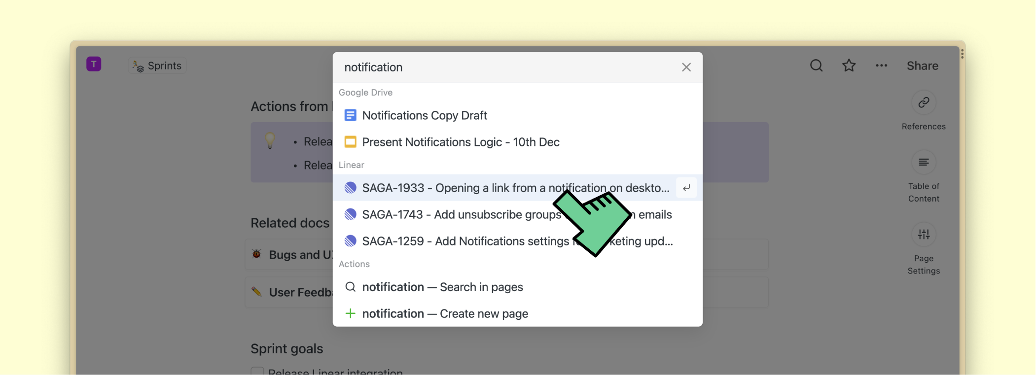 Ahora puedes buscar números de Linear y abrirlos en el navegador o en la aplicación Linear directamente desde el menú de búsqueda de Saga. Haz clic en cualquiera de los números para abrirlos.