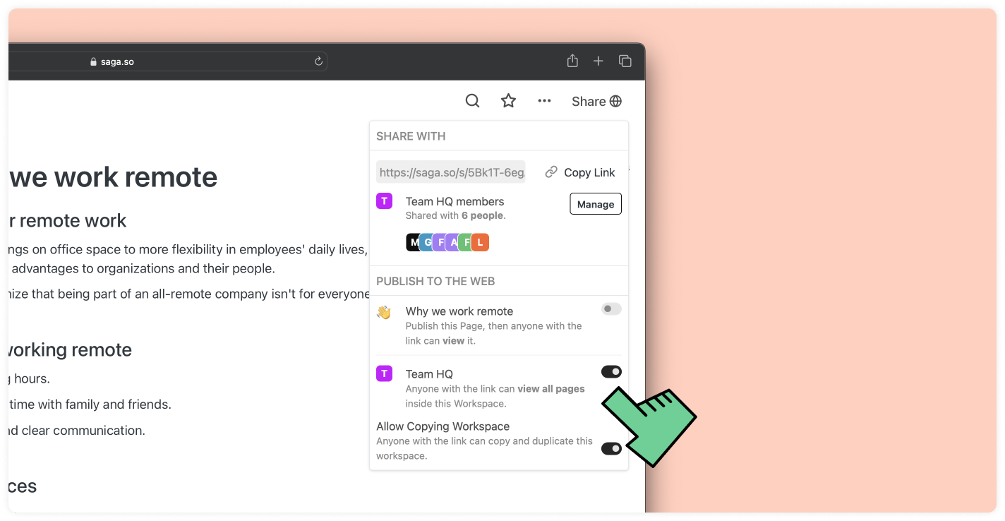 Saga te permite compartir todo tu espacio de trabajo como un sitio web público, para que puedas compartir tu contenido con el mundo exterior.