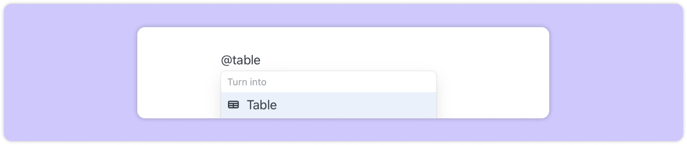 Tipo **@table ** en el editor y seleccione el ** Tabla ** botón para crear una tabla.