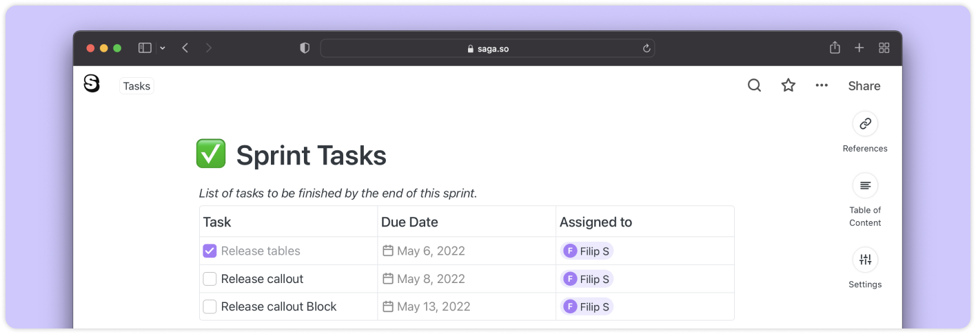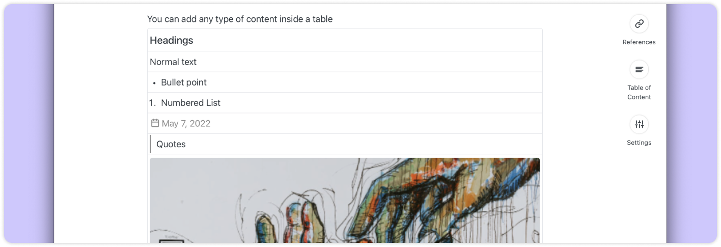 Las tablas de Saga son flexibles y puedes añadir texto simple, así como encabezados, listas, imágenes, enlaces, fechas, bloques activos, bloques de código y cualquier otro tipo de contenido dentro de una tabla.