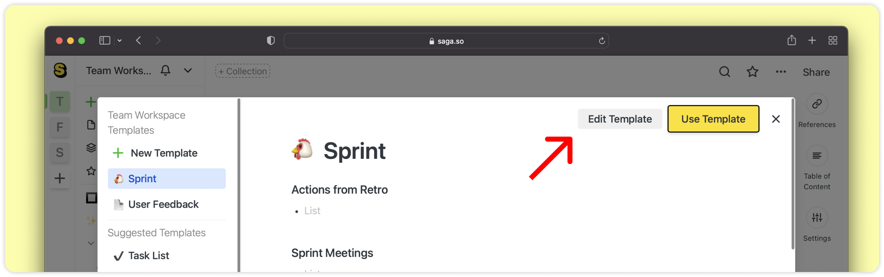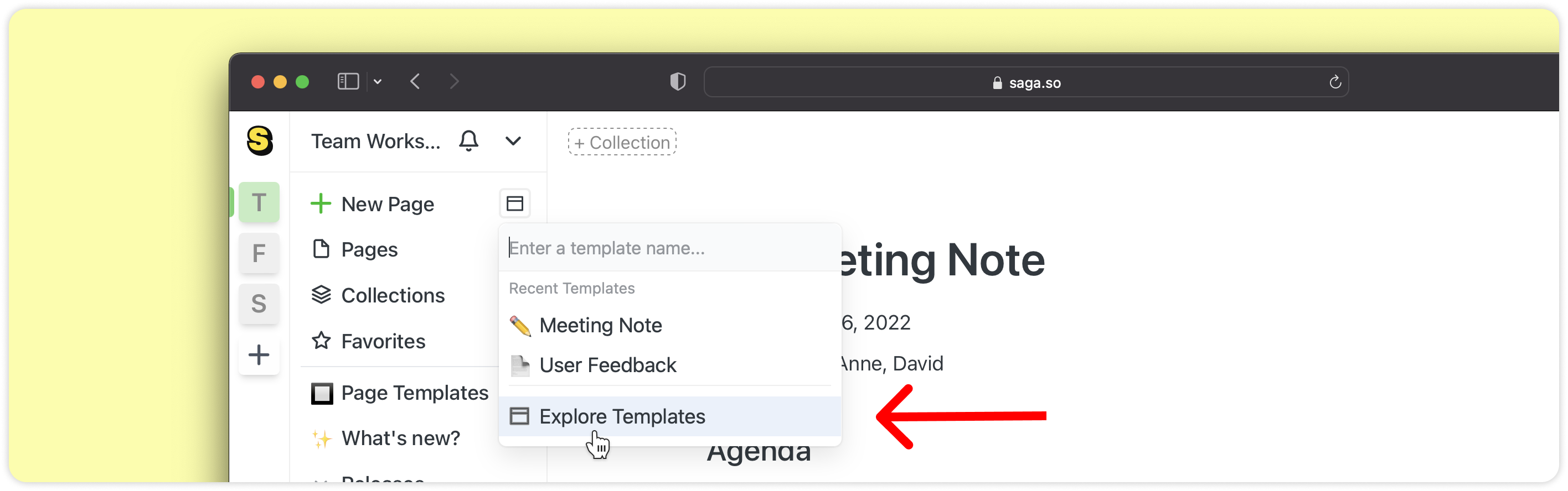 Las notas de las reuniones, las especificaciones, los planes o incluso las notas diarias suelen contener la misma estructura. Ahora es fácil y rápido empezar desde tu plantilla o usar cualquier plantilla predefinida que hayamos añadido a la galería de plantillas de Saga.