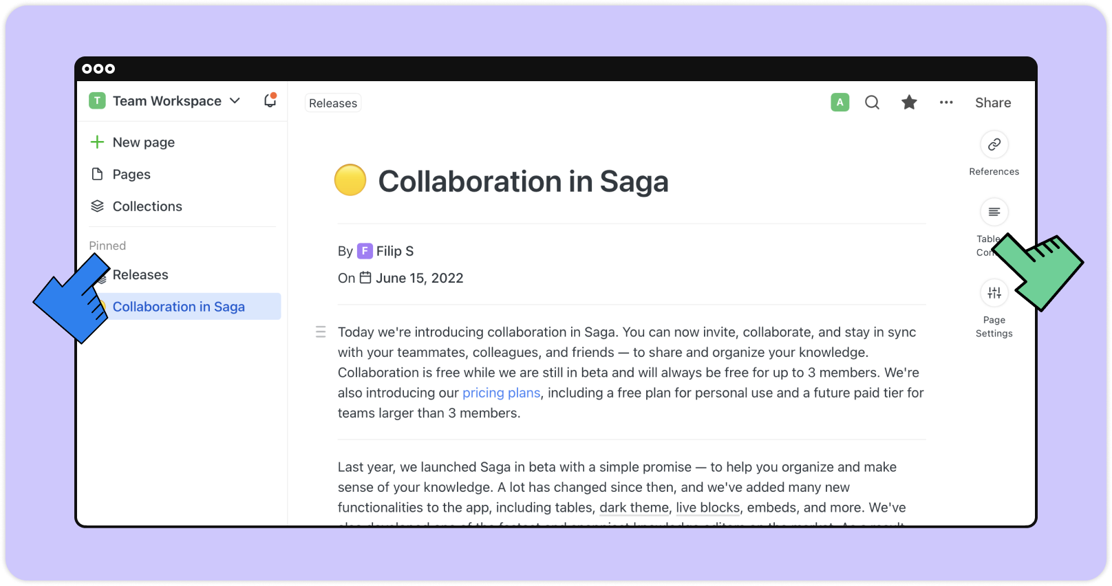 En esta versión, presentamos algunas funciones muy esperadas en Saga que muchos de ustedes solicitaron: historial de versiones, una sección de favoritos personales, así como múltiples actualizaciones del editor y de rendimiento.