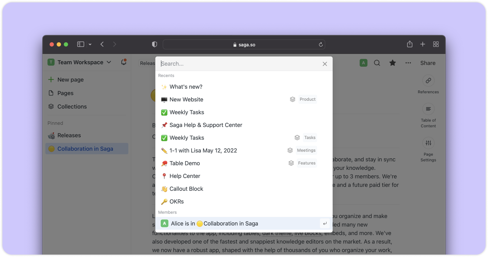 La velocidad y el rendimiento son importantes para nosotros. La última aplicación de escritorio ahora es más rápida, las tablas para páginas, colecciones y tareas se cargan instantáneamente, y la búsqueda y el editor son más ágiles en espacios de trabajo grandes con miles de páginas.