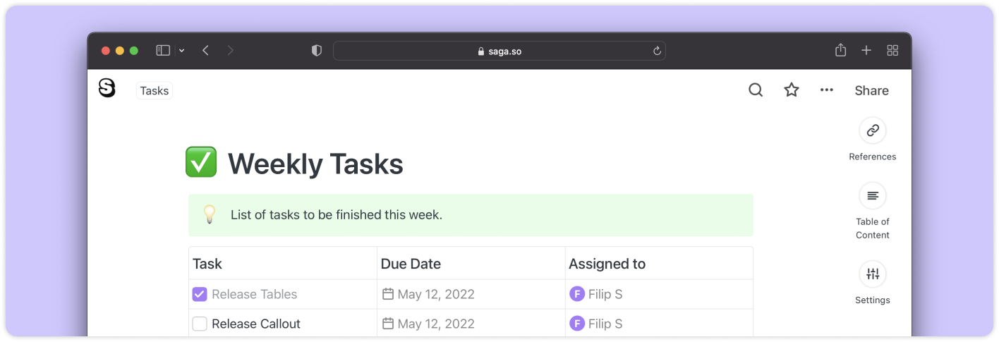 Organiza tu conocimiento en el formato que necesites. Las tablas en Saga son flexibles, y puedes agregar texto simple, así como encabezados, listas, imágenes, fechas, bloques en vivo y cualquier otro tipo de contenido compatible. Escribe @table en el editor para comenzar.