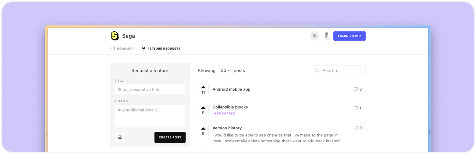 Para simplificar las cosas, hemos implementado un tablero de comentarios donde compartir tus comentarios es aún más fácil. Puedes acceder a él mientras estás conectado a tu cuenta de Saga y serás notificado cuando haya actualizaciones en tus solicitudes.
