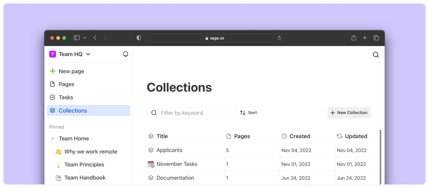 Organiser le travail peut être délicat. Les collections dans Saga vous aident à regrouper le contenu lié au même endroit pour qu’il soit rapidement accessible. Elles sont comme des dossiers, sauf que vous pouvez avoir une seule page dans plusieurs collections en même temps. Vous pouvez également ajouter une collection à l’intérieur d’une autre collection et les imbriquer indéfiniment.