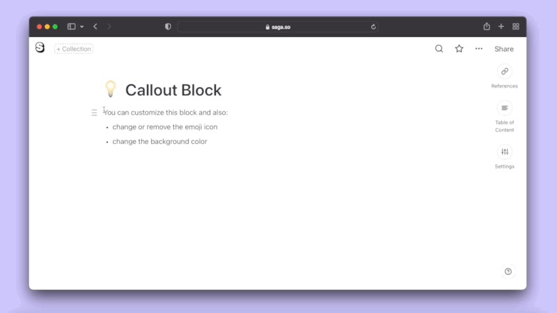 Les encadrés dans Saga sont flexibles et vous pouvez ajouter toutes sortes de contenu à l’intérieur, y compris du texte, des listes, des images, des titres, des tâches, des tableaux et des blocs dynamiques.