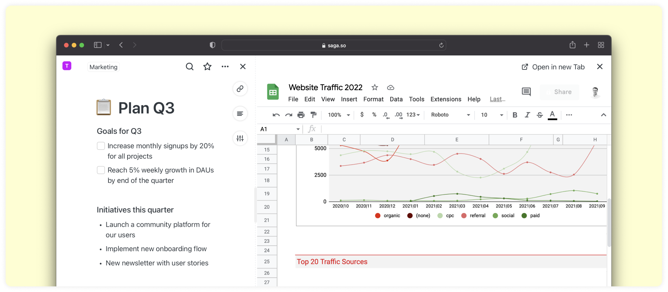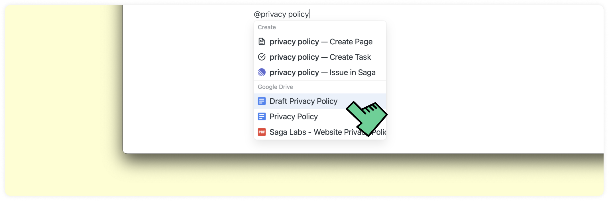 Si vous avez un compte Google pour un usage personnel ou professionnel, vous pouvez désormais ouvrir, rechercher et mentionner des fichiers Google Drive directement dans Saga. Cela inclut Google Docs, Google Sheets, Google Slides, Google Forms, ainsi que tous les dossiers ou fichiers stockés dans votre Google Drive.