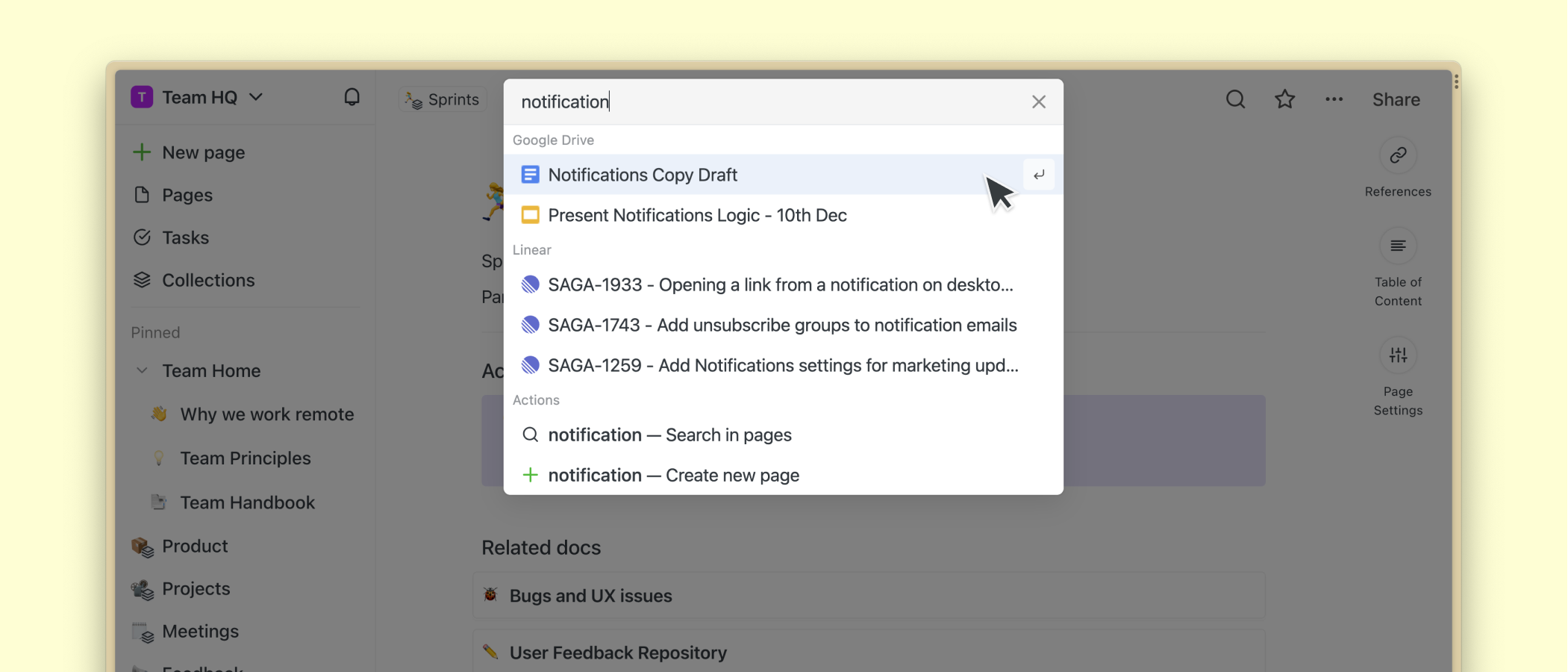 L’un des principaux concepts de Saga est de vous aider, vous et votre équipe, à connecter les informations stockées dans différents systèmes. Il est maintenant possible de rechercher et de retrouver des informations d’autres outils comme Google Drive et Linear directement dans Saga. D’autres intégrations arrivent également bientôt.