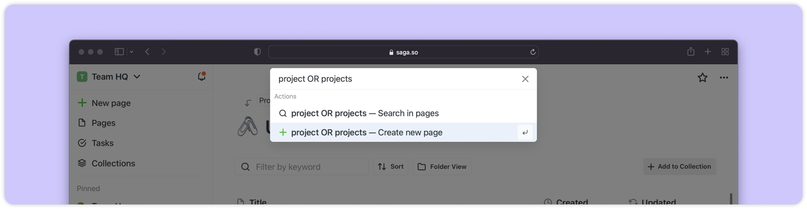 Lorsque vous tapez une requête de recherche dans le menu Recherche, Saga vous suggérera de créer une page pour vous. C’est un raccourci particulièrement utile pour créer une nouvelle page en utilisant uniquement votre clavier.