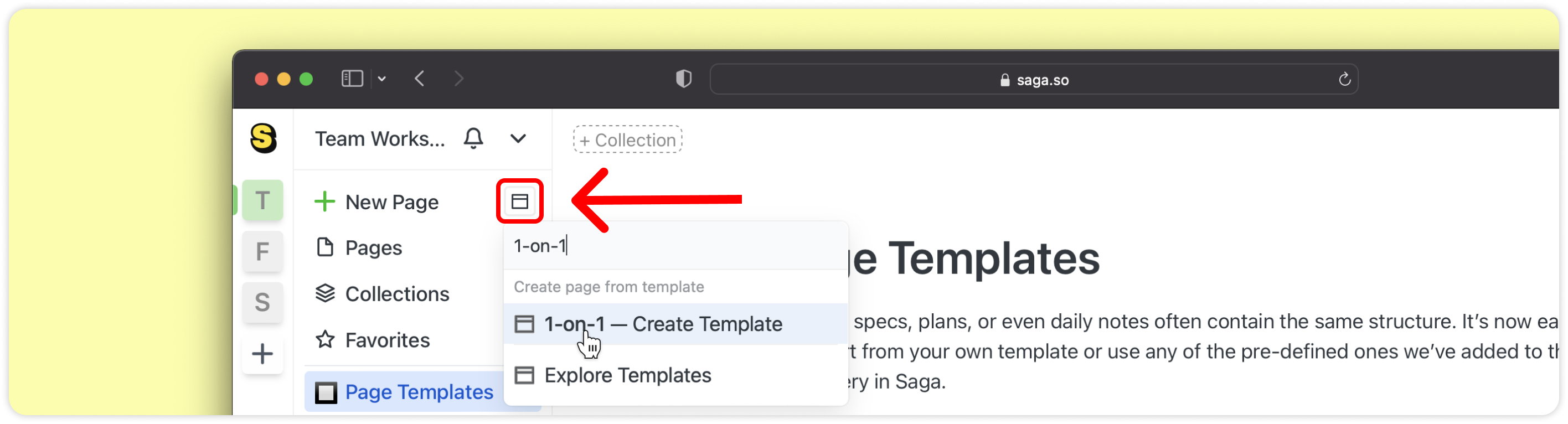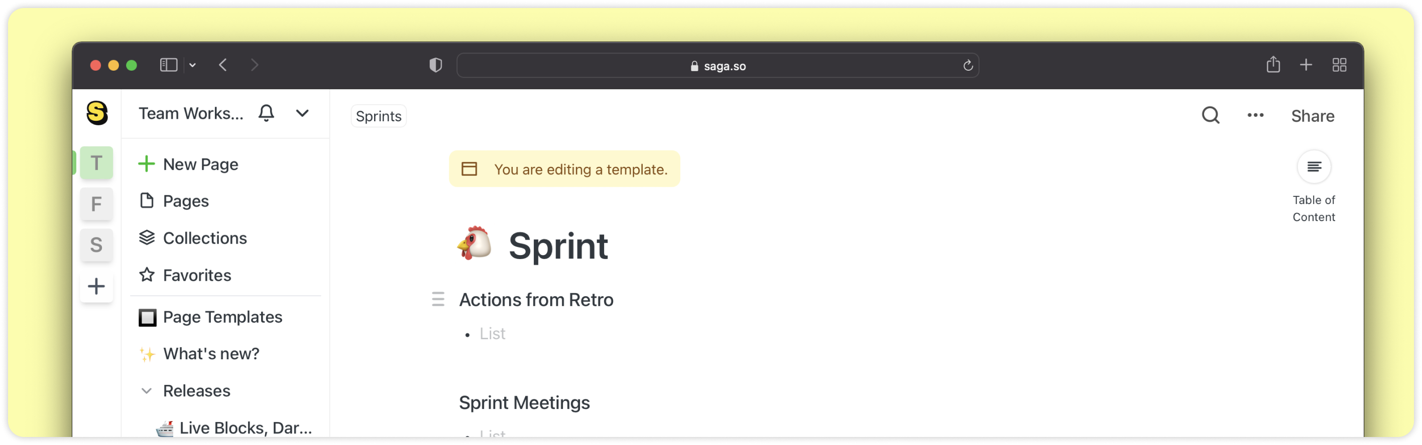 Les notes de réunion, spécifications, plans ou même les notes quotidiennes contiennent souvent la même structure. Il est désormais facile et rapide de partir de votre modèle ou d’utiliser l’un des modèles prédéfinis que nous avons ajoutés à la galerie de modèles dans Saga.