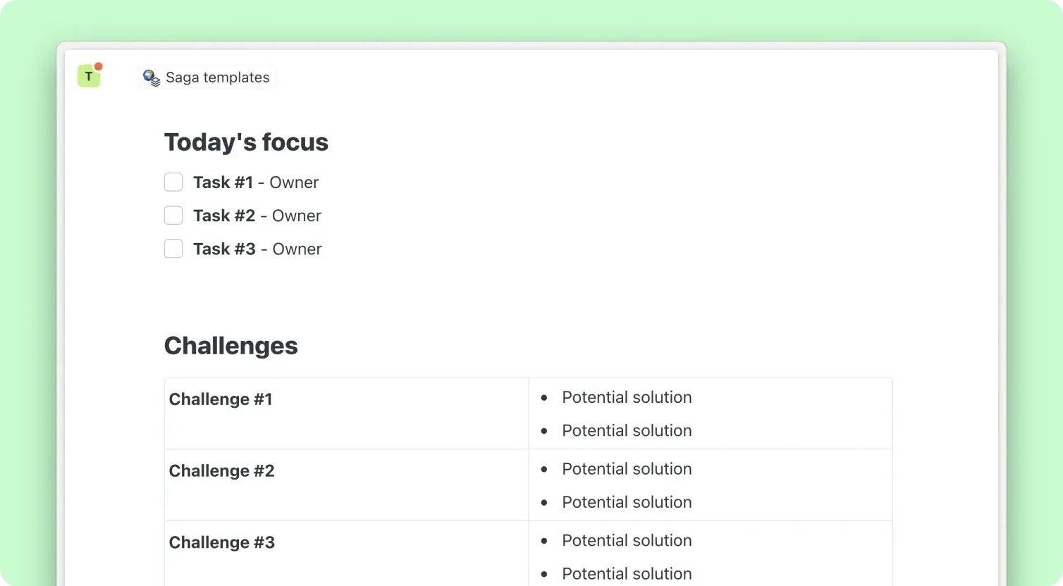 Pour vous aider à créer et à maintenir vos points quotidiens, accédez à notre modèle gratuit. Il est structuré pour vous guider dans la documentation des mises à jour, des défis et des plans futurs de votre équipe, vous facilitant ainsi qu’à votre équipe de garantir la clarté et la cohérence dans vos flux de communication d’équipe.
