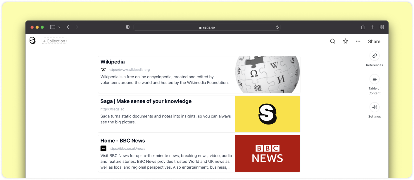 Beaucoup d’entre vous nous ont aidés à tester et améliorer la version collaborative de Saga. Restez à l’écoute – notre prochaine version se concentrera sur l’apport de la collaboration à tout le monde. Vous pourrez bientôt travailler avec d’autres en temps réel, mentionner d’autres membres de l’équipe et recevoir des notifications automatisées.