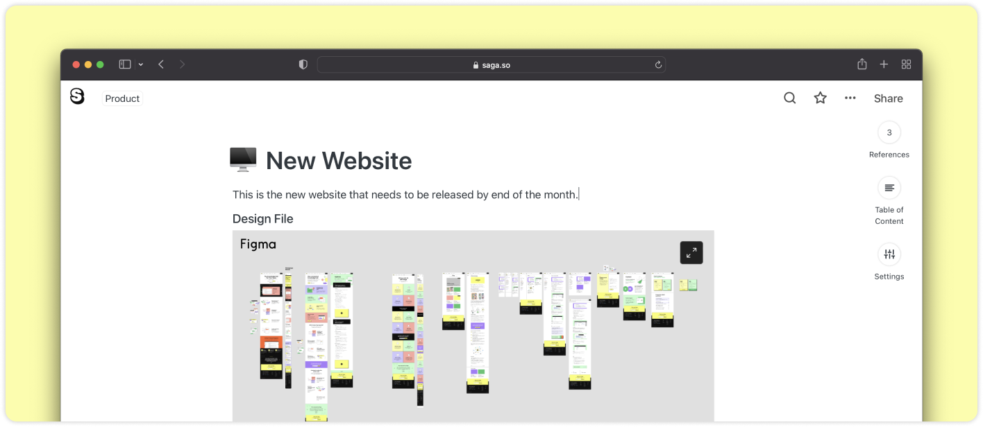 Vous pouvez maintenant intégrer du contenu d’autres applications dans Saga ! Consultez vos fichiers de design de Figma, lisez des fichiers audio de SoundCloud, ajoutez votre playlist Spotify ou prévisualisez des extraits de code de Codesandbox sans quitter votre espace de travail.