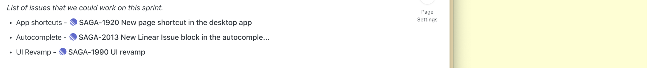 If you use Linear you can now mention, search, or paste live links to Linear issues directly in Saga. This will help you connect information stored in Linear to Saga and display that in a clearer and more beautiful way.