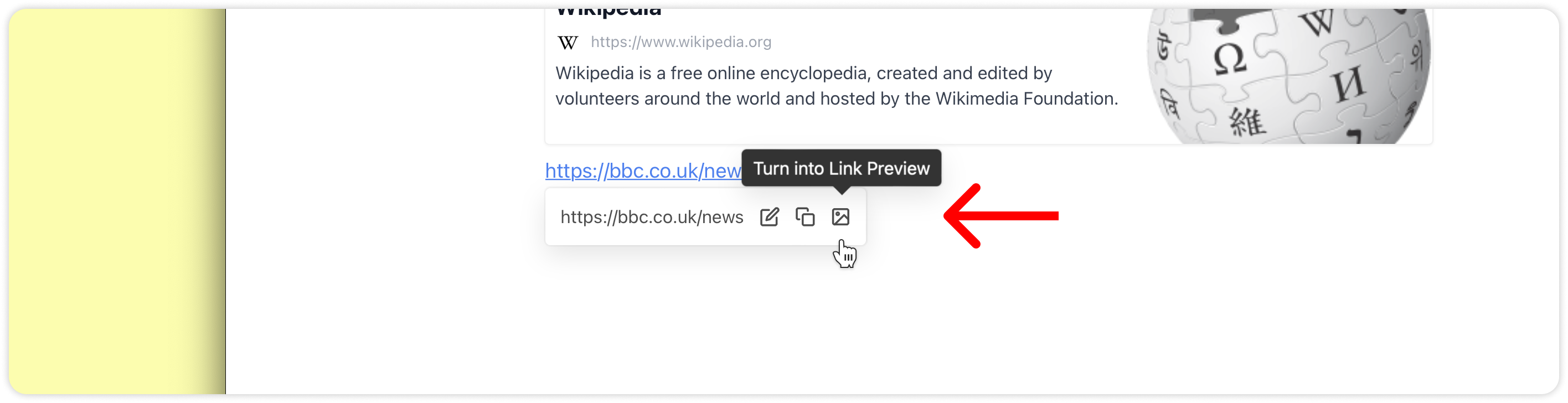 Alternatively, hover over a pasted link and click on the Turn into Preview icon.