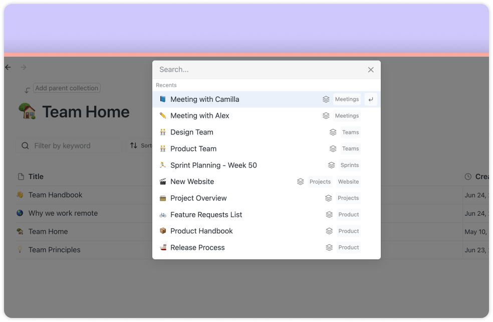 - Type a page or collection title to quickly navigate to it.