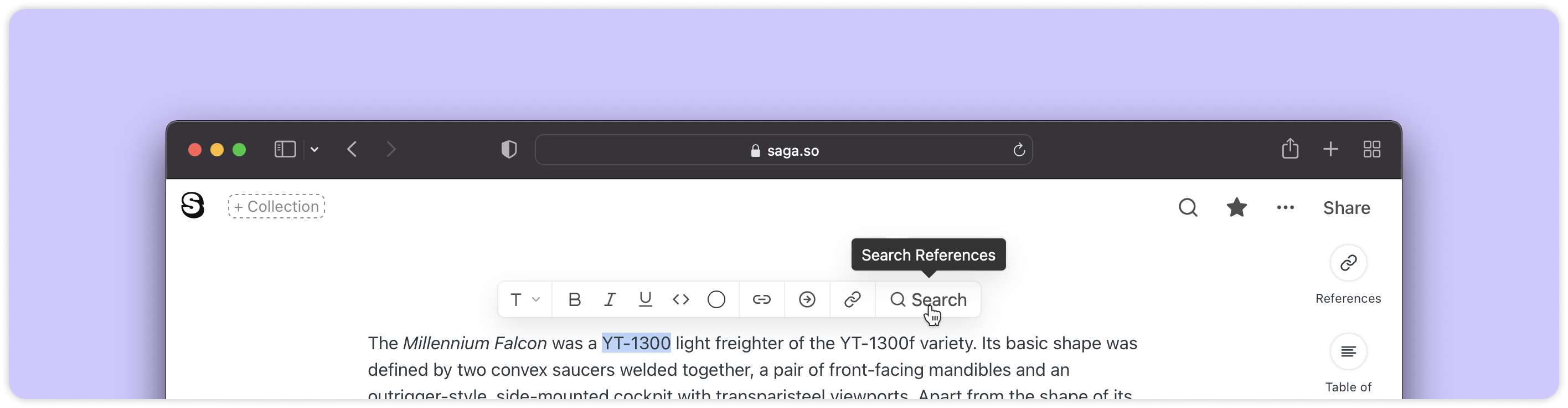 Para pesquisar rapidamente referências de texto em suas páginas, selecione o texto para abrir o barra de ferramentas flutuante. Em seguida, clique no ícone 🔍 à direita do menu para pesquisar referências para essa seleção de texto. As referências aparecerão no lado direito da tela.