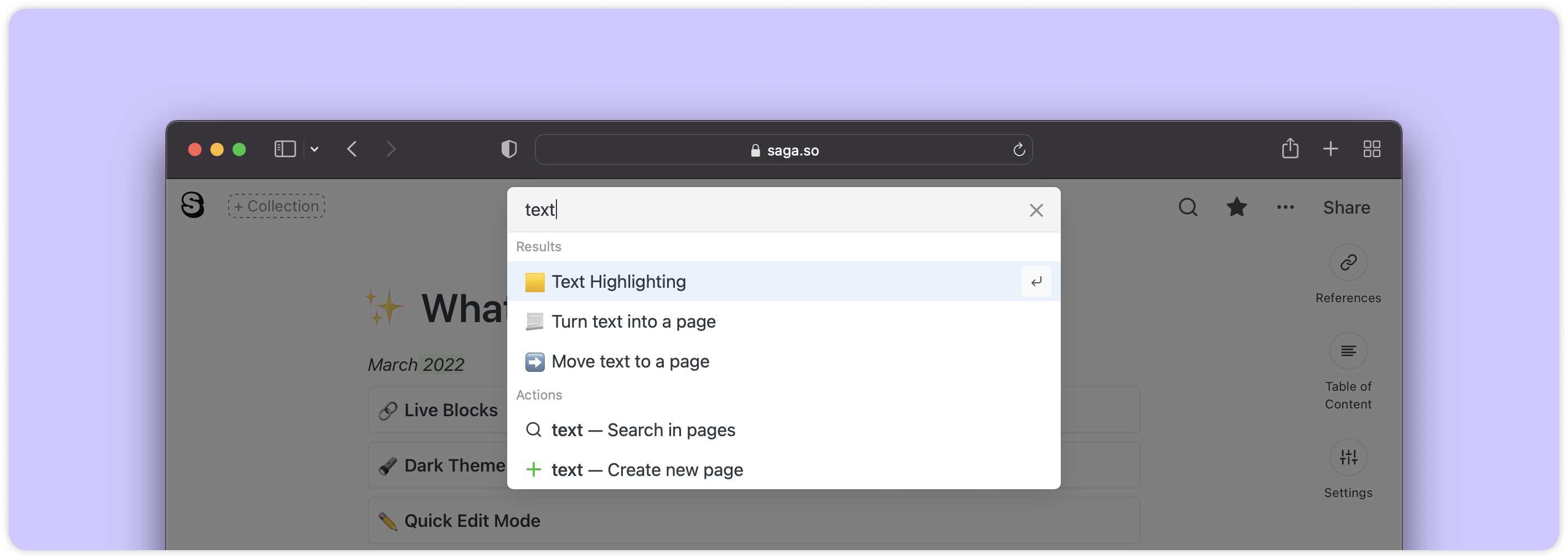 O menu Pesquisar no Saga ajuda você a encontrar instantaneamente as informações certas. Ele combina um alternador rápido de navegação entre páginas e coleções com uma pesquisa de texto completo por referências em suas páginas.