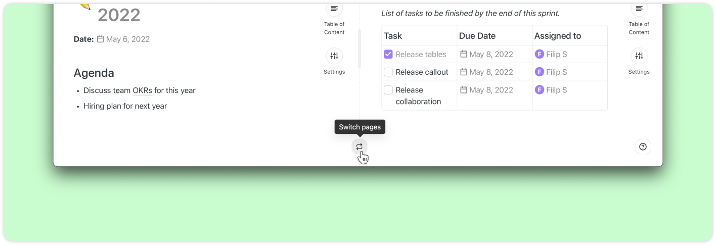Quando você tem duas páginas abertas lado a lado, você pode facilmente mudar sua posição. Basta clicar no botão de troca na parte inferior da tela.