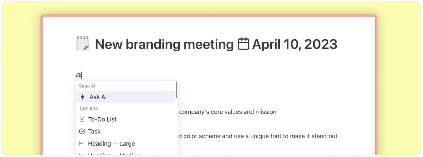 - Para obter um primeiro rascunho ou uma resposta para sua pergunta, digite @ ou / em qualquer lugar no editor Saga e clique em Pergunte à IA. Uma lista de comandos também está disponível, como esboço, e-mail, pauta da reunião, cópia de mídia social, etc.