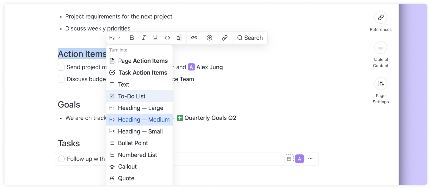 As páginas do Saga são personalizáveis. Você pode adaptar cada página às suas necessidades específicas, seja adicionando uma lista com marcadores em uma nota de reunião, adicionando uma lista de verificação como tarefa pendente ou separando partes do documento com títulos grandes. Todo tipo de conteúdo, sejam imagens, textos, listas etc. é chamado de bloco. Você pode adicionar os seguintes blocos dentro de uma página: