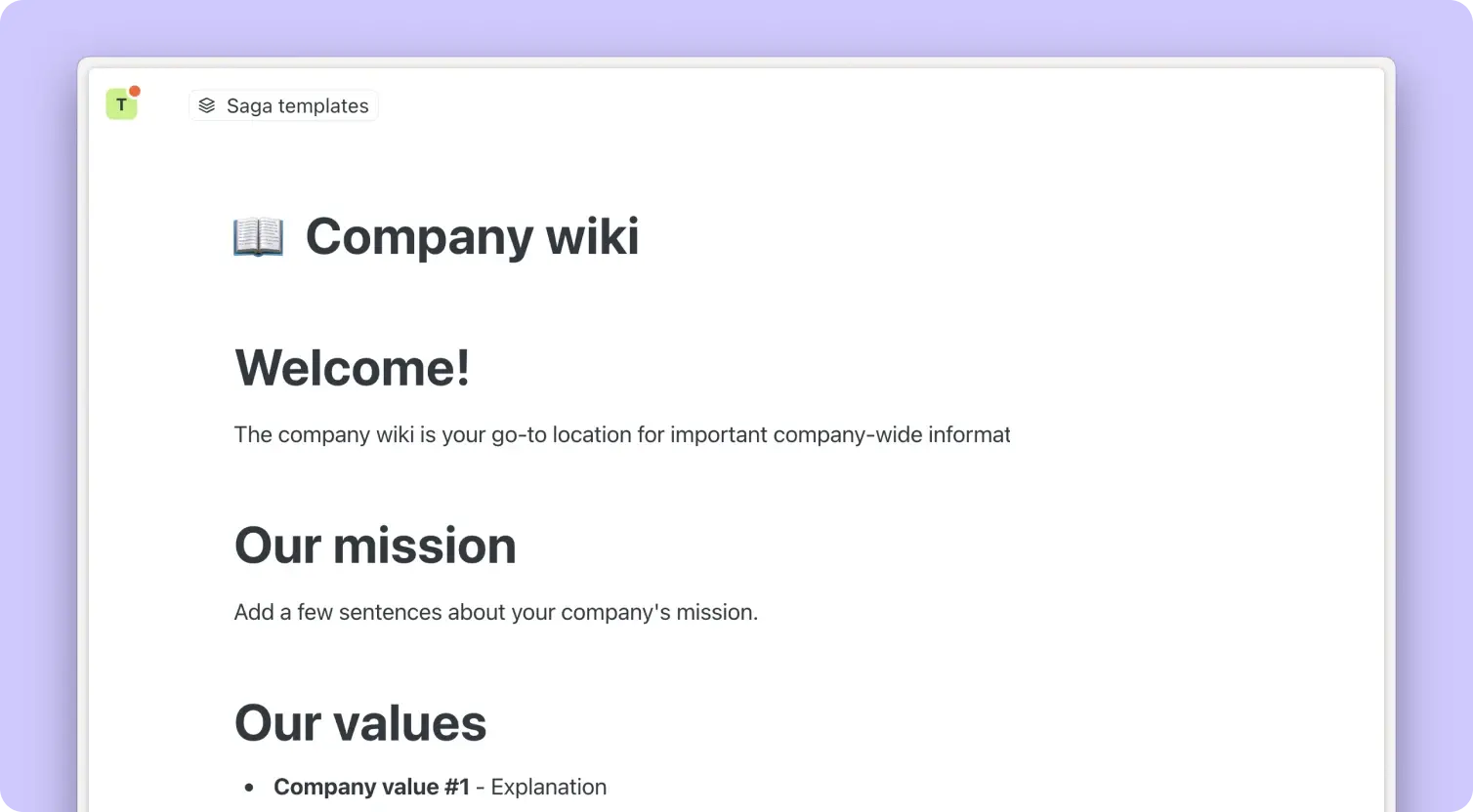 Os wikis da empresa são projetados para serem fáceis de usar, pesquisáveis e acessíveis, facilitando que os funcionários encontrem as informações que precisam quando precisam. Isso pode variar de valores da empresa para políticas de RH, documentação de projetos e melhores práticas.
