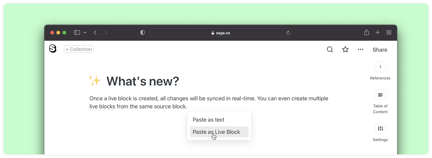 - Quando você copia conteúdo de uma página e cola em outra, o Saga sugerirá colar o conteúdo como texto ou criar um Bloco ao Vivo a partir do conteúdo colado.