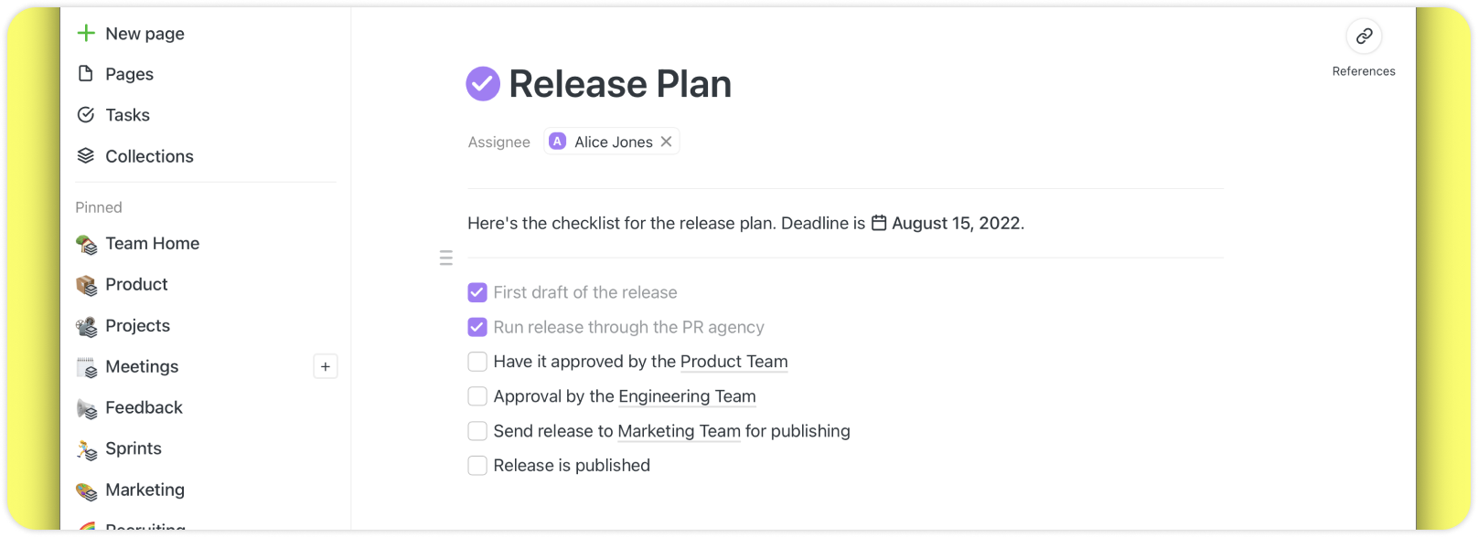 Este novo recurso torna fácil integrar tarefas dentro de suas notas e documentos. Você pode criar tarefas em páginas, atribuí-las aos seus colegas e gerenciá-las de um só lugar. Você não precisa alternar entre diferentes aplicativos de notas e gerenciamento de projetos.