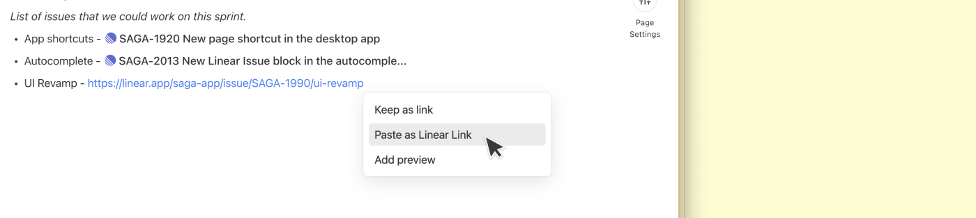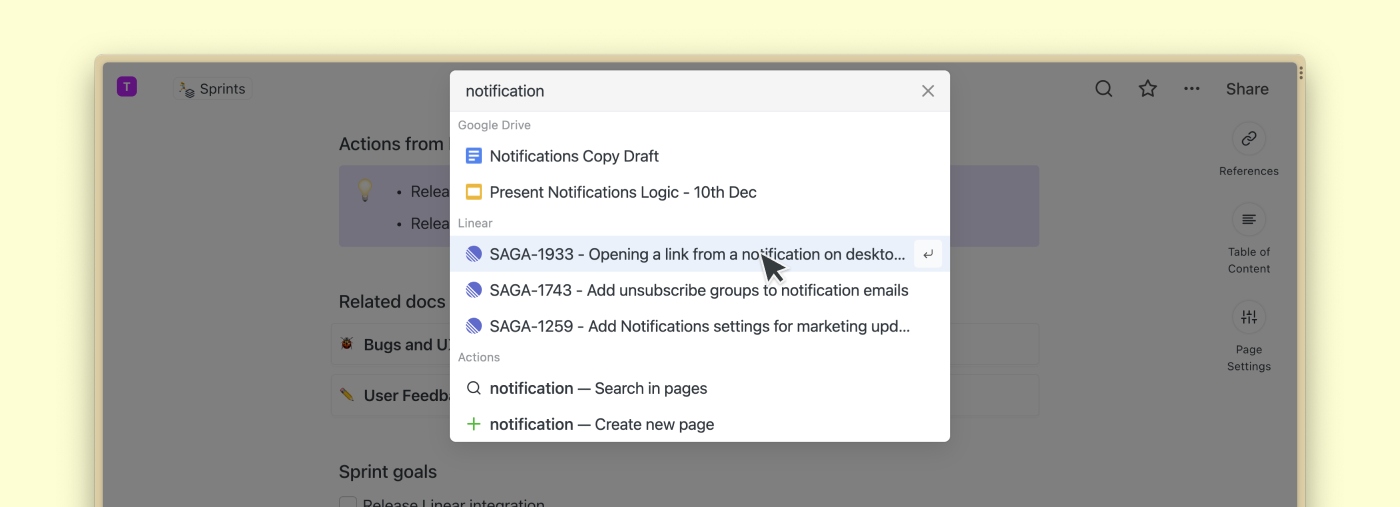 You can mention an issue inside pages and tasks by inserting a Linear block or by simply pasting a Linear link in the editor. Search in Saga also includes results from your issue board. Check the next section for more details.